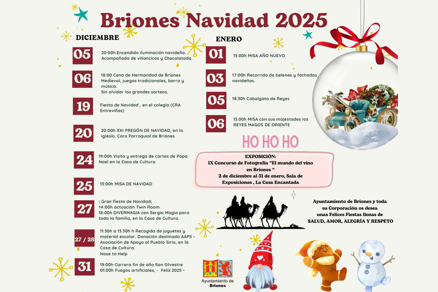 El Ayuntamiento de Briones invita a todos a vivir la magia de estas fiestas y a disfrutar de una Navidad llena de salud, amor, alegría y respeto.