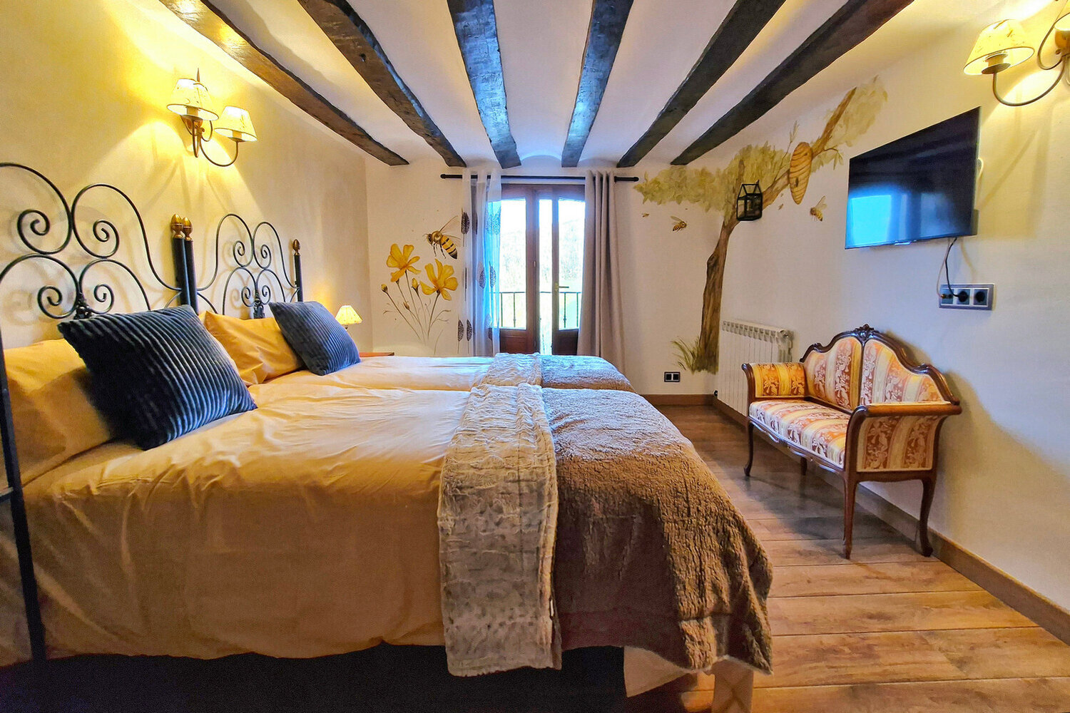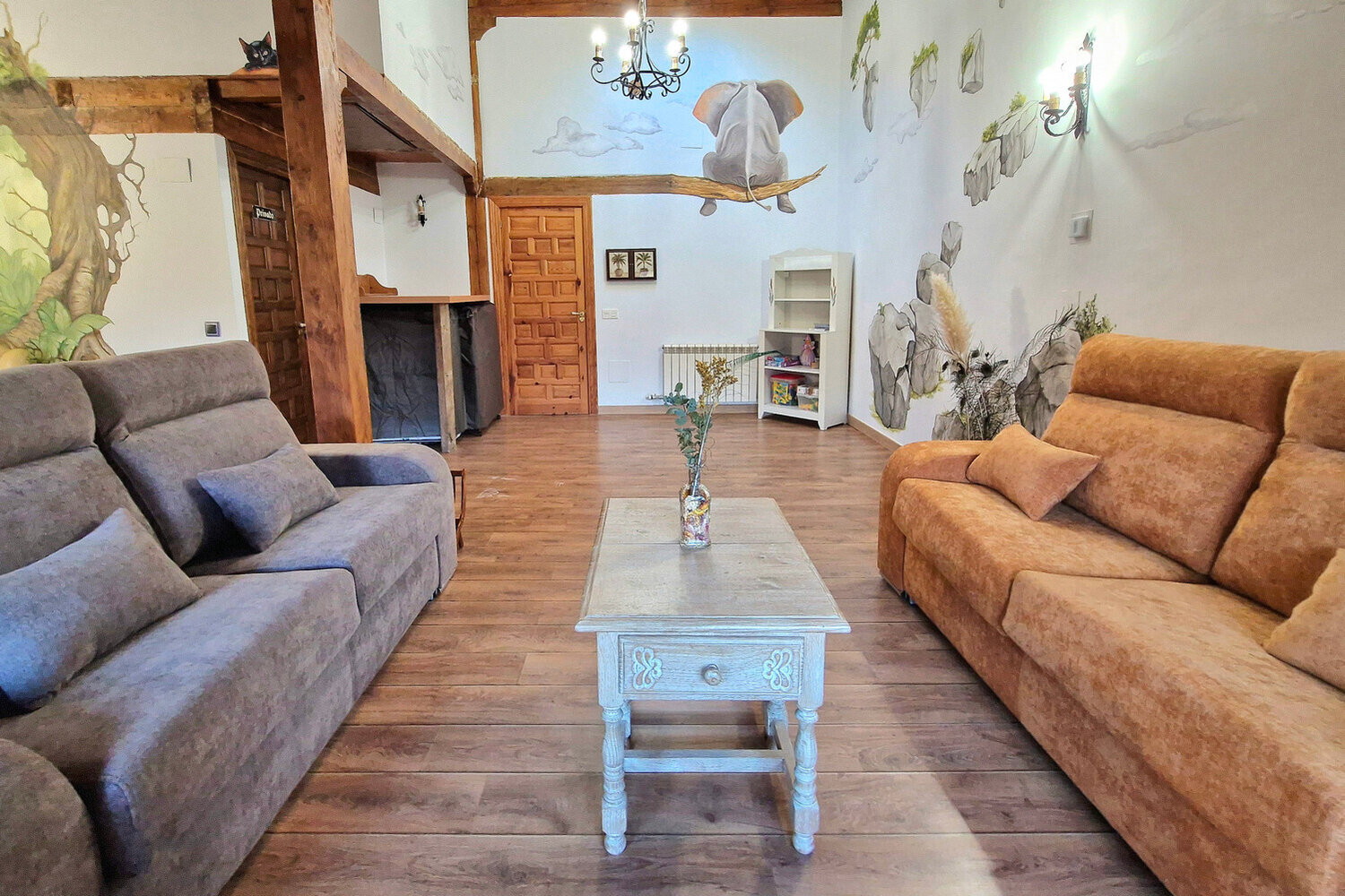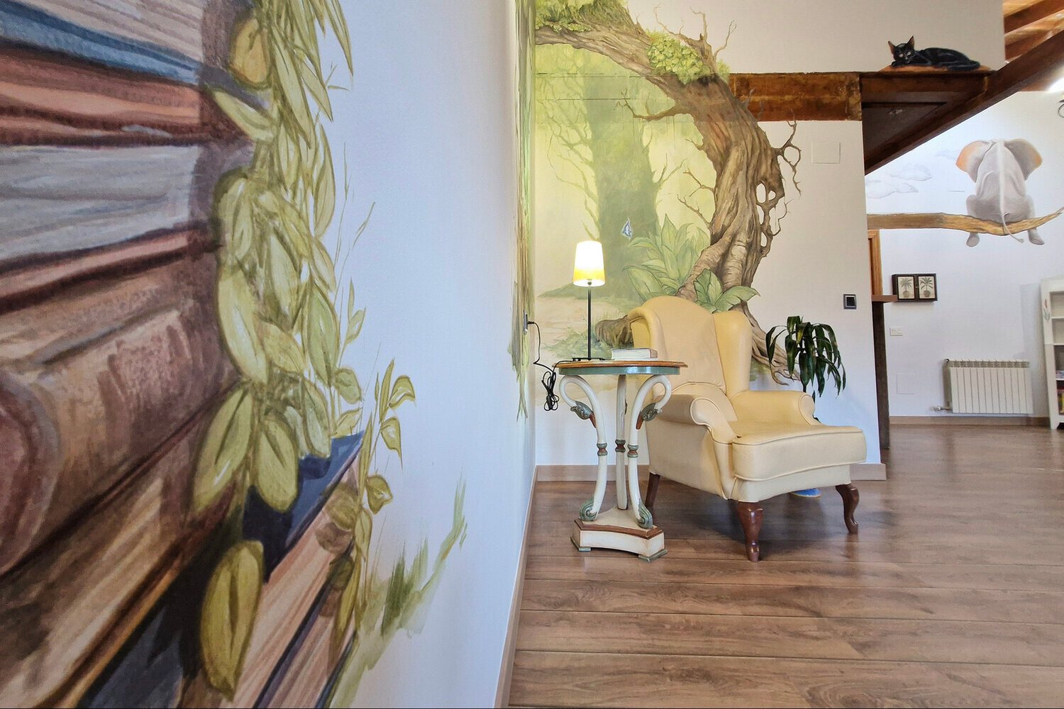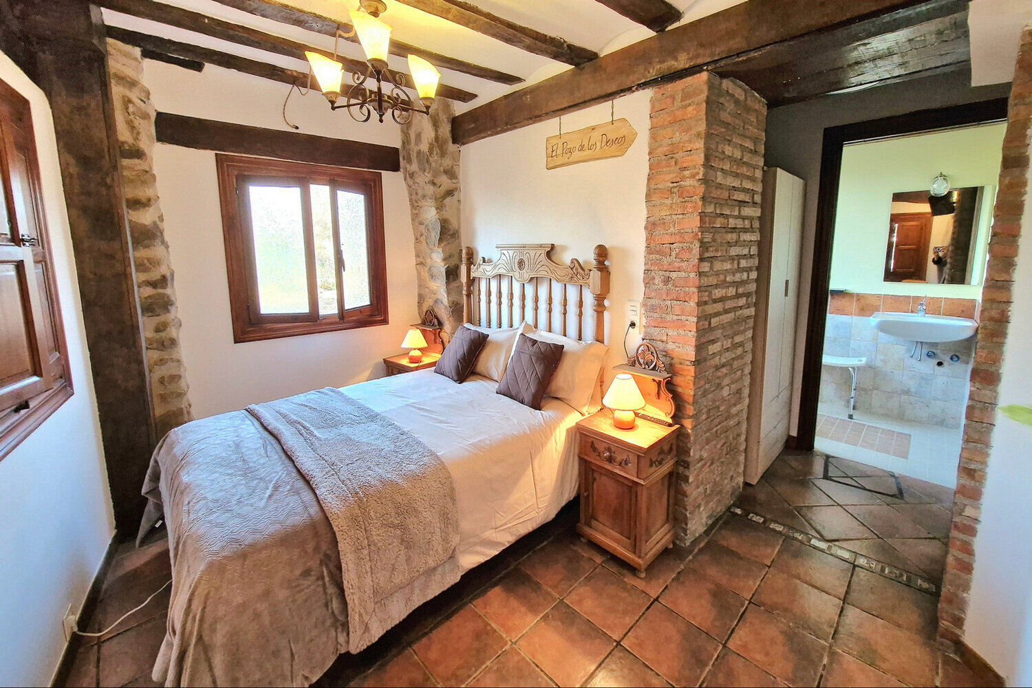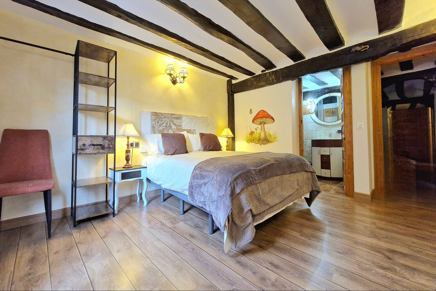 La casa cuenta con 8 habitaciones con baño privado, una de ellas adaptada para personas con movilidad reducida. Cada estancia ha sido cuidadosamente decorada por la artista Susana Garay, que ha pintado a mano cada habitación con una temática distinta. Los detalles únicos de cada espacio crean una experiencia envolvente y personalizada que convierte cada noche en un viaje diferente.