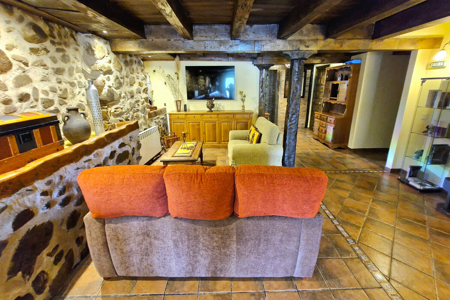 El acogedor salón-comedor con chimenea es el alma de la casa, ideal para compartir veladas inolvidables. La cocina está totalmente equipada para grupos grandes, y el jardín con porche, barbacoa y zona de bar invita a disfrutar al aire libre, haga el tiempo que haga.