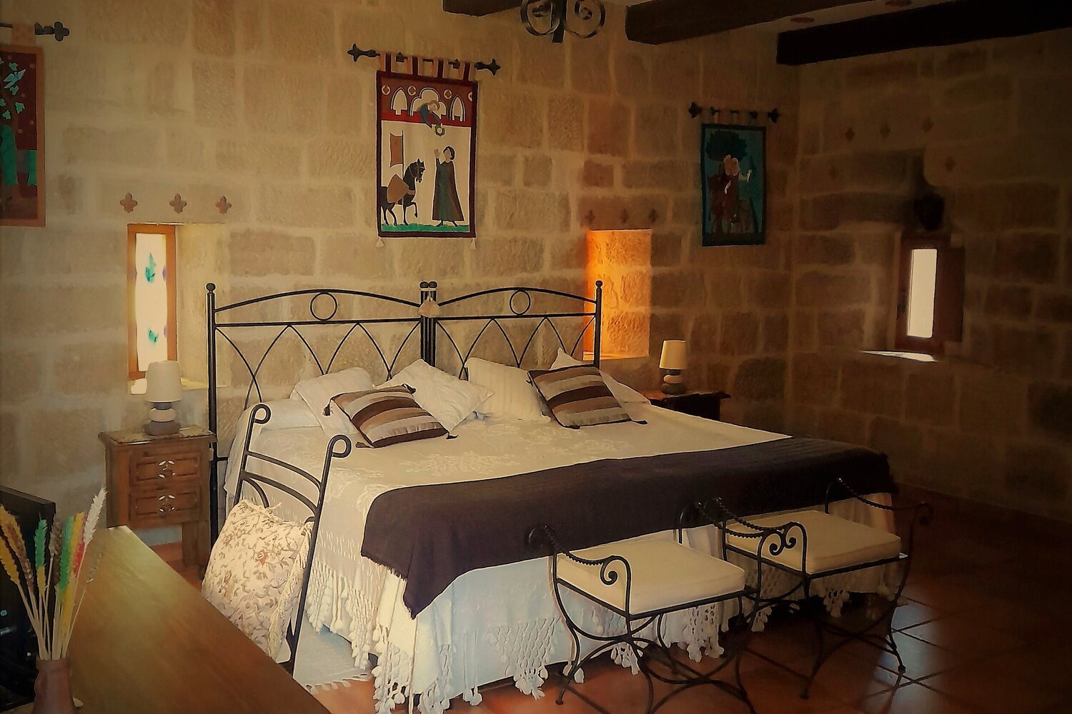 Un cómodo ascensor, accede directamente a cada una de sus cuatro amplias y hermosas suites, de 35m2, y situadas una en cada planta de la torre, también se puede acceder a ellas por una escalera de caracol de hierro forjado.